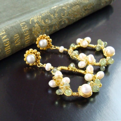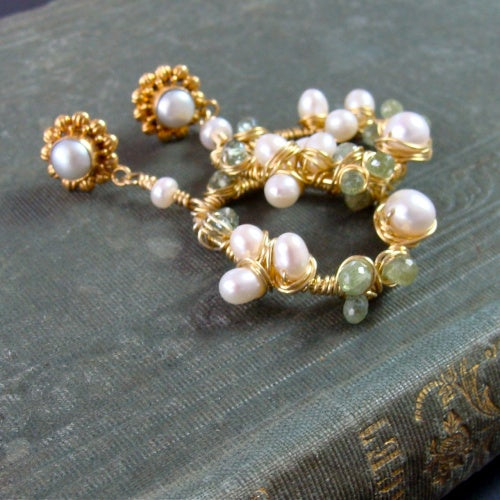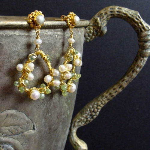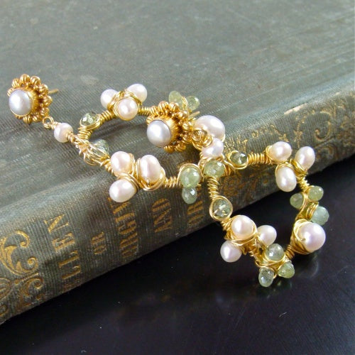 Organic and irregularly shaped 24k gold vermeil rings have been hand wrapped with 24k gold vermeil wire and encrusted with the colors of green hydrangeas. Creamy white pearls and soft kiwi green kyanite and prasiolite begin to take shape like the little individual flowers that form a dramatic mophead of blooms. 1.75" long from ear post.
